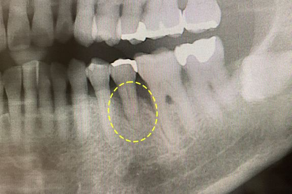 右下奥歯から膿が出るという主訴で来院。歯周再生療法、PDT療法で改善したケースです。