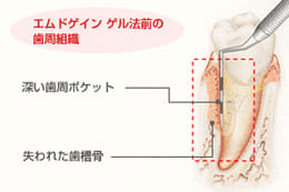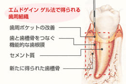 スウェーデンで開発されたエムドゲインは、歯周外科の治療後に塗布することにより、破壊されたセメント質などの再生を図るものです。